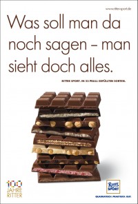 Wir werden euch in den kommenden Wochen hier im Blog vorab verschiedene Plakatmotive zeigen, die zur Abstimmung stehen. Die Hauptdarsteller sind wie immer unsere RITTER SPORT Tafeln in gewohnter Begleitung eines knackigen Spruches. Und um diesen geht es auch. Uns interessiert: Welcher Spruch gefällt euch am besten und weshalb?