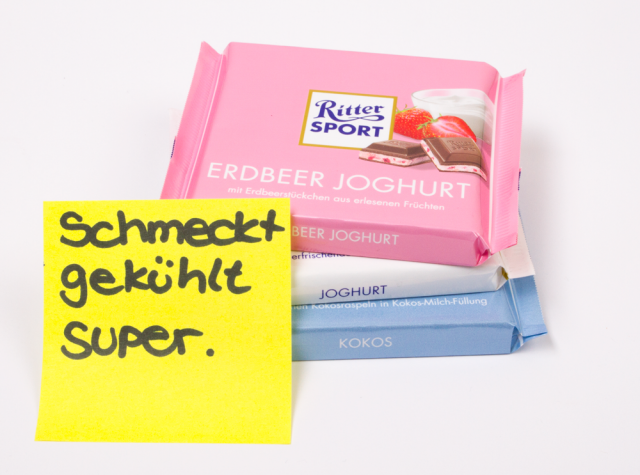 Im Sommer genieße ich RITTER SPORT Schokolade am liebsten gut gekühlt. Wenn sie mir dann doch einmal davonläuft, weil ich sie in der Sonne oder im Handschuhfach vergessen habe, wird die weiche Masse einfach mit Quark verrührt und blitzschnell in ein köstliches Desser verwandelt 🙂