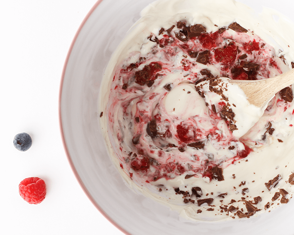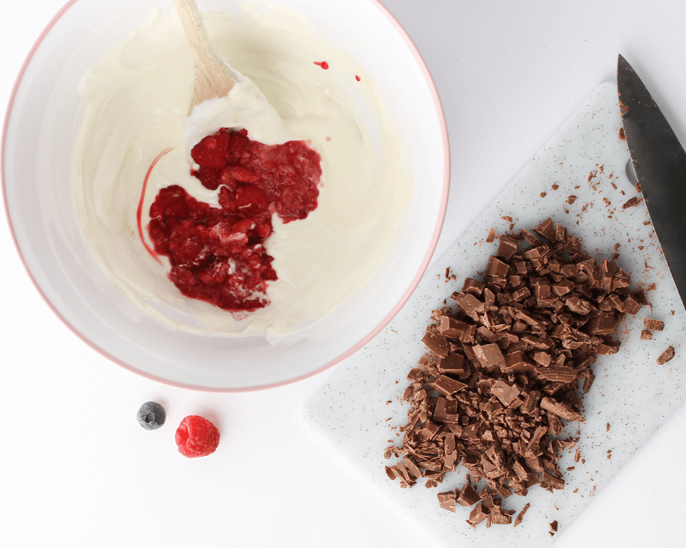 5 – Füllt die Mischung in die Silikonform. Dekoriert die Oberfläche mit den verbliebenen Himbeeren, Blaubeeren und Schokoraspeln. Sorgt dafür, dass die Deko sicher in der Mischung steckt.