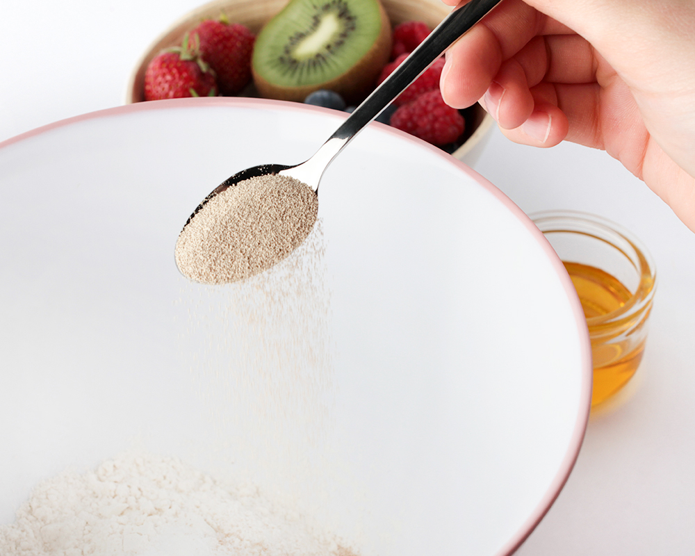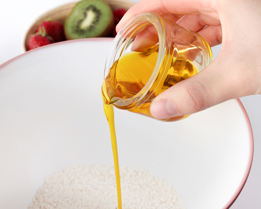 1 – Vermengt zuerst das Mehl, den Vanillezucker, die Hefe, das Salz und das Rapsöl zu einer Masse.