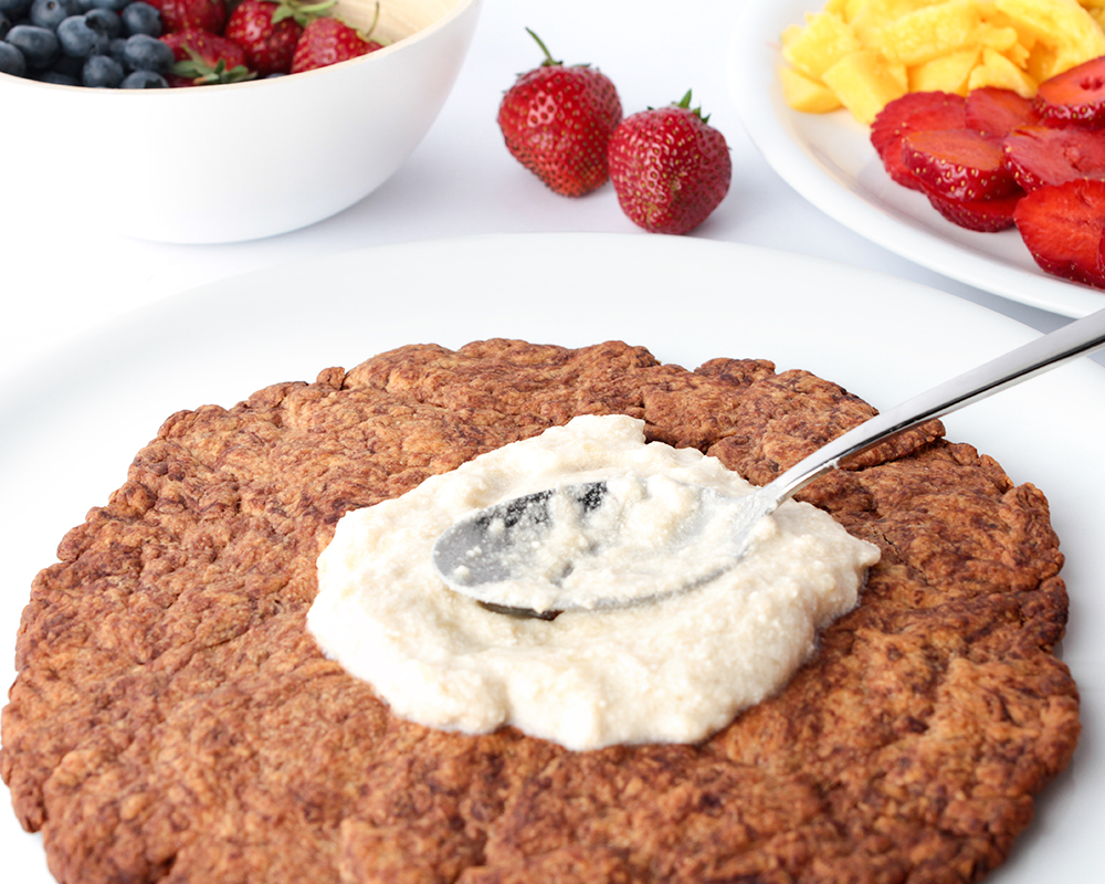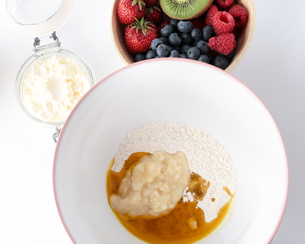 4 – Nun geht es ans Topping: Für den cremigen Belag zerdrückt ihr eine halbe Banane und vermengt diese mit einer Packung Mascarpone. Anschließend wir die Creme auf dem Teigboden mit einem Löffel verteilt.