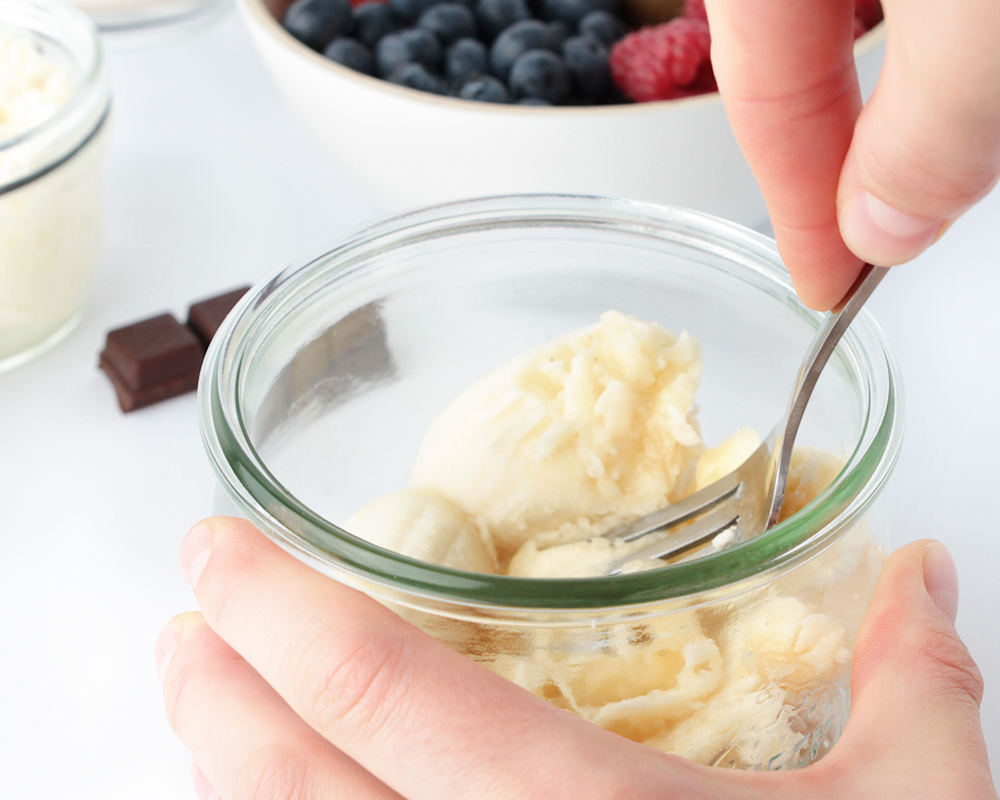 2 – Zerdrückt oder püriert eine der Bananen mit einer Gabel oder einem Pürierstab und gebt diese zur restlichen Masse hinzu. Zerkleinert anschließend eine Tafel der Kakao-Klasse (wir haben die Feine aus Nicaragua genutzt, aber ihr könnt natürlich mit der Sorte eurer Wahl arbeiten 😉 ) mit einem Messer und gebt auch diese hinzu. Verrührt die Masse gut, deckt sie mit einem Tuch ab und lasst sie für circa 40 Minuten an einem warmen Ort ruhen.