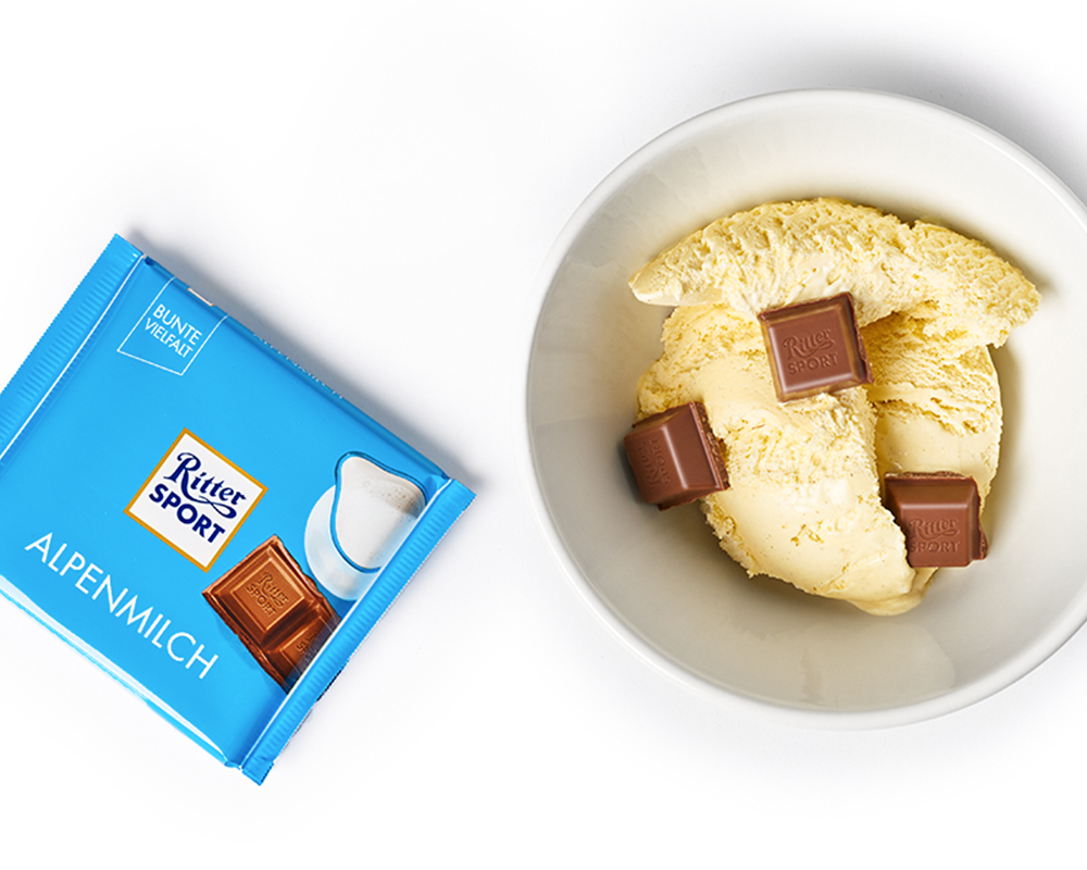 Last but not least: Eis! Auch das lässt sich einwandfrei mit ein paar Schokoladenstückchen aufpeppen. Wir haben uns für unsere Alpenmilch entschieden. Ihr könnt da aber natürlich jede andere Sorte verwenden. Mit diesem kalten Genuss heißen wir dann auch offiziell den Sommer willkommen! 😎☀️