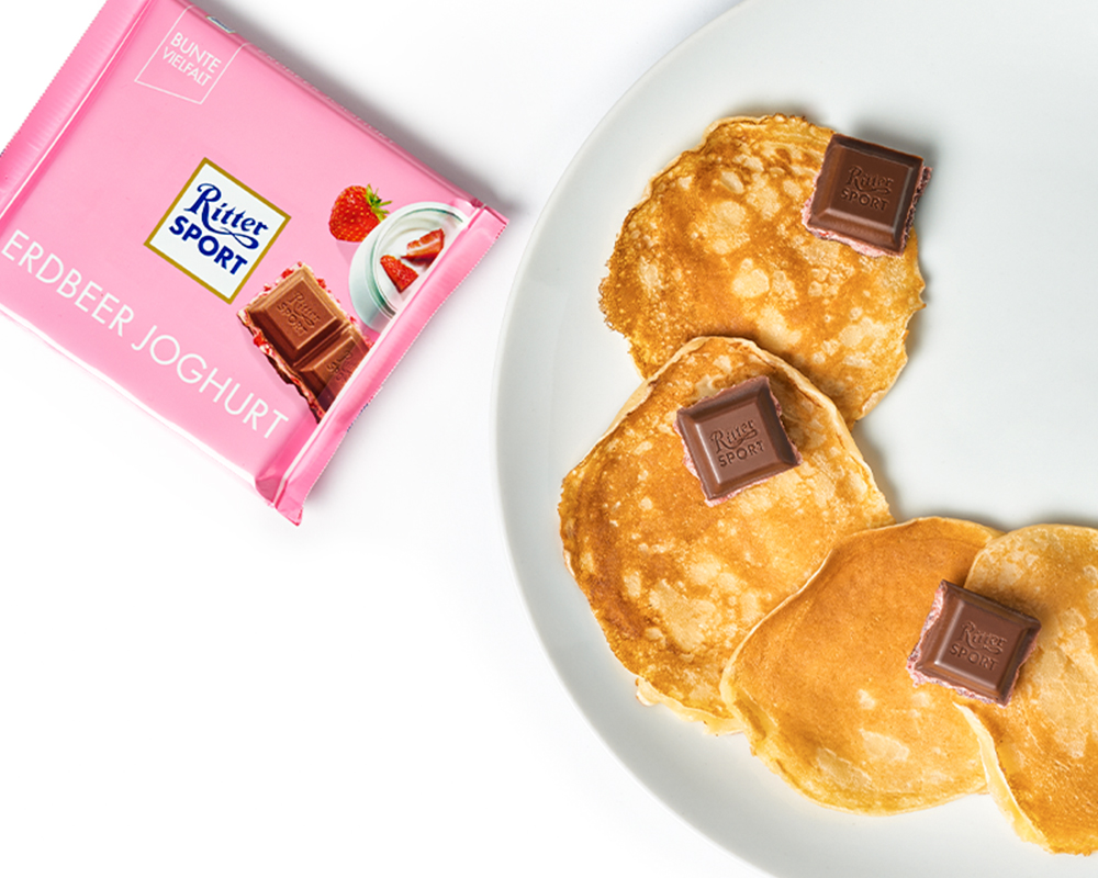 Ahornsirup kann ja jeder. Wir toppen unsere Pancakes lieber mit unserer fruchtigen Erdbeer Joghurt und haben damit gleich drei Toppings in einem: Schokolade, Erdbeeren und Joghurt! Auf warmen Pancakes zerläuft die Schokolade und verteilt sich über die ganze Fläche. Probiert es aus, ihr werdet begeistert sein! 🍫