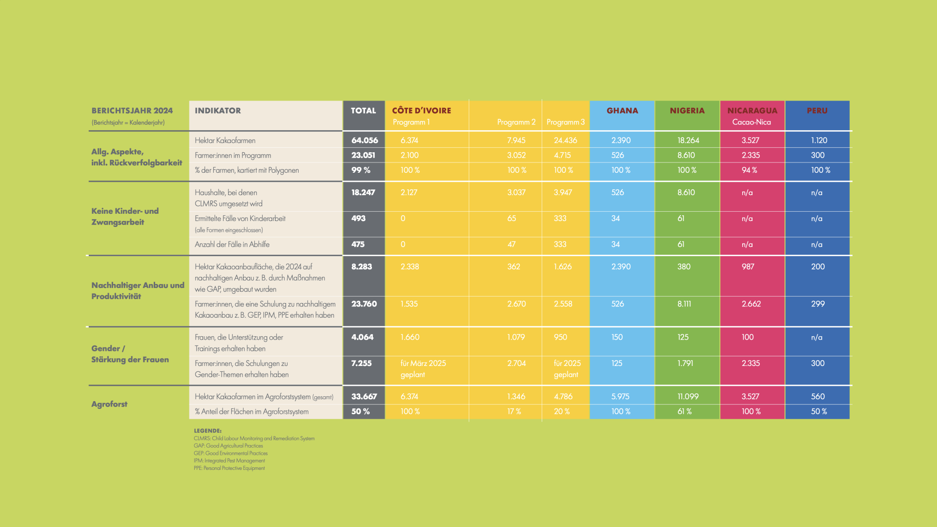 Nein, das war kein Tippfehler. 2024 ist richtig. Mit dem Kakao-Report dokumentieren wir rückblickend, was wir im vergangenen Jahr erreicht haben. Und weil es sehr aufwendig ist, aus insgesamt sieben verschiedenen Kakaoprogrammen in fünf unterschiedlichen Ländern Zahlen, Inhalte und Ergebnisse zusammenzutragen, erscheint unser Kakao-Report 2024 eben im Oktober 2025.